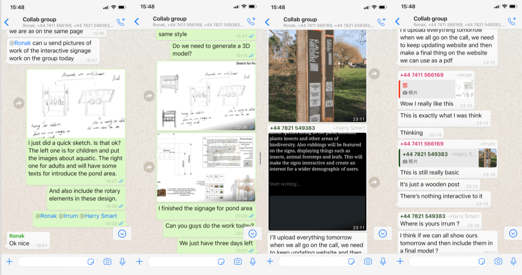 3. Because of special circumstances, we almost always do the group discussion online. In the early stage, we would discuss our design ideas every day, and after every meeting with the tutor, we would make an appointment to make a phone call to discuss how to sublimate our design concept, and list the tasks for everyone. (images 1) we will also send our homework to the group and ask the team members to discuss and give feedback on everyone’s homework. If everyone thinks the homework is well done, that person will finish it. If the team members think it needs improvement, that person will improve and correct the work. (image 2) Group cooperation enables members to supervise and urge each other, and this group cooperation also increases my ability to cooperate.